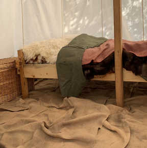 Notre camp, composé de plusieurs tentes médiévales et d'une tonnelle, est ouvert au public, qui peut visiter une tente décorée. Nous vivons le temps d'une journée ou d'un week-end comme à l'époque et nous préparons nos repas à partir de recettes médiévales.
